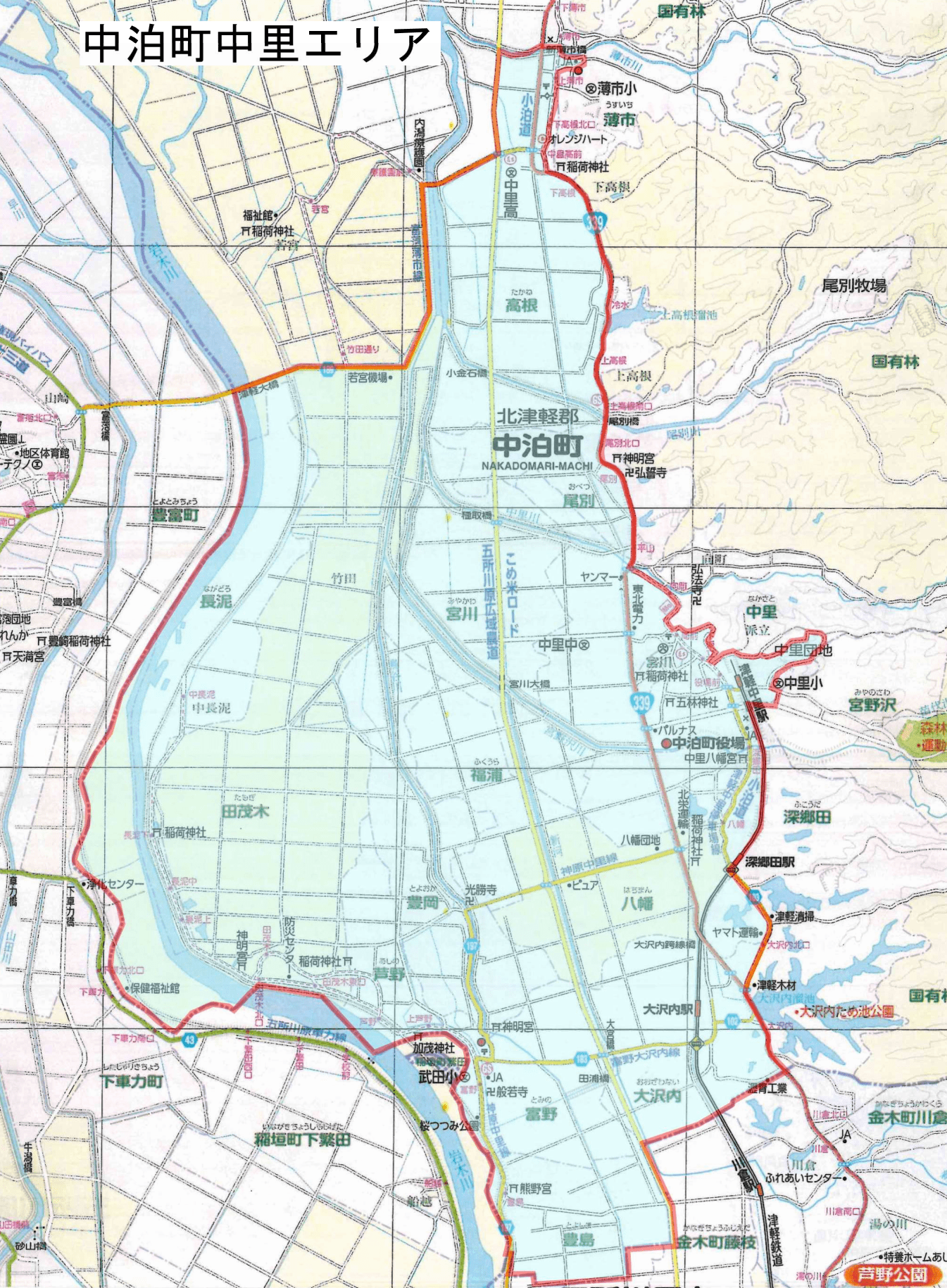 Main town name | Nakadomari-cho Usuichi Okihara (east side of rice/rice road), Takane (west side of National Route 339), Miyagawa, Obetsu (west side of National Route 339), Nagadoro, Tamogi (south side of Prefectural Route 189), Fukagoda ( North of Fukagoda Station is west of Tsugaru Railway, South of Fukagoda Station is west of Prefectural Route 103), Fukuura, Yawata, Ashino, Tomino, Toshima, Osawauchi (west of National Route 339), Toyooka, Nakazato (west of Prefectural Route 103) |