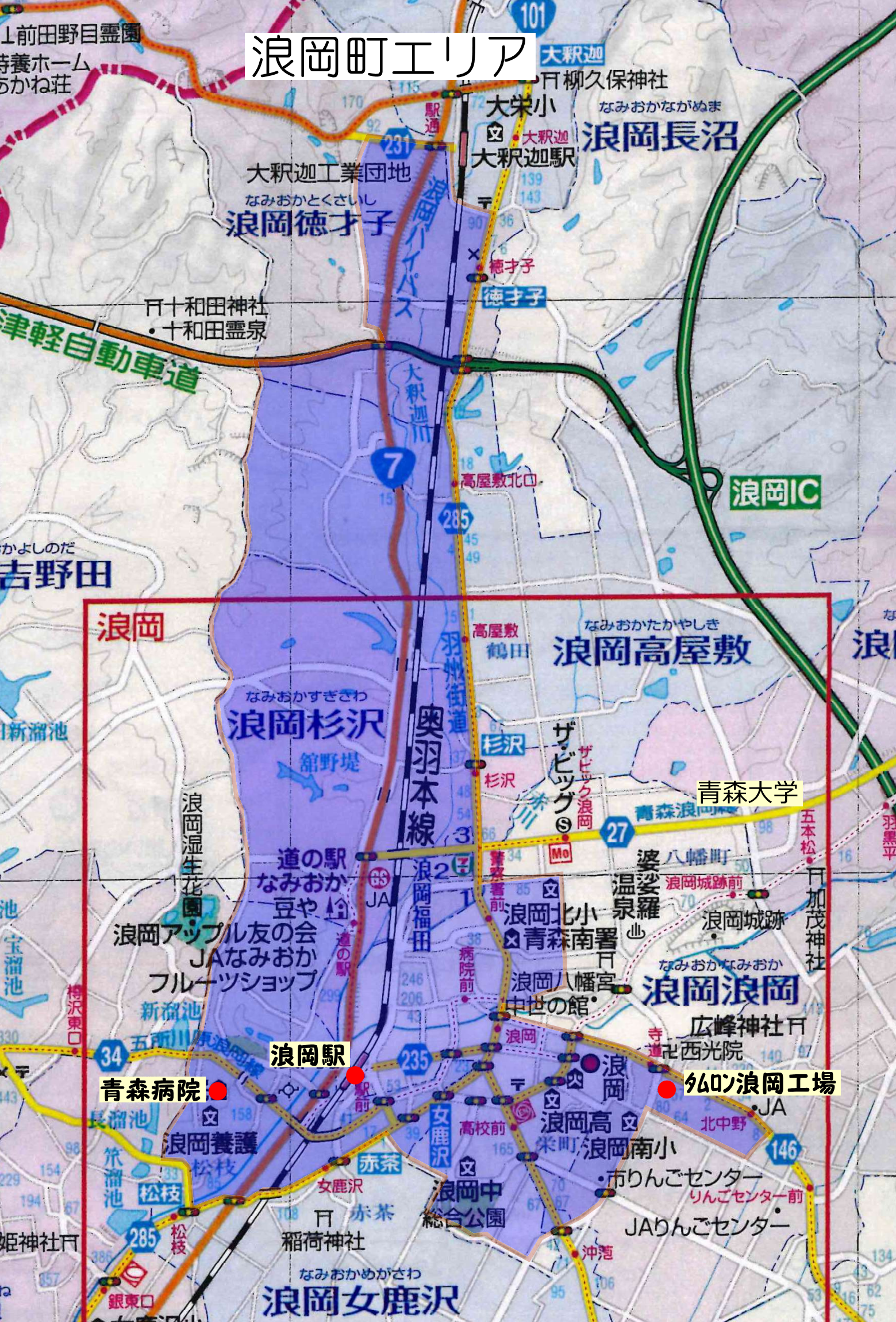 Main facilities | Roadside Station Namioka, Dashaka Industrial Park, Aomori Hospital, Aomori Prefectural School for the Handicapped, Tamron Namioka Factory, Namioka Station, Dashaka Station, Aomori Medieval House, Aomori Municipal Namioka Hospital |