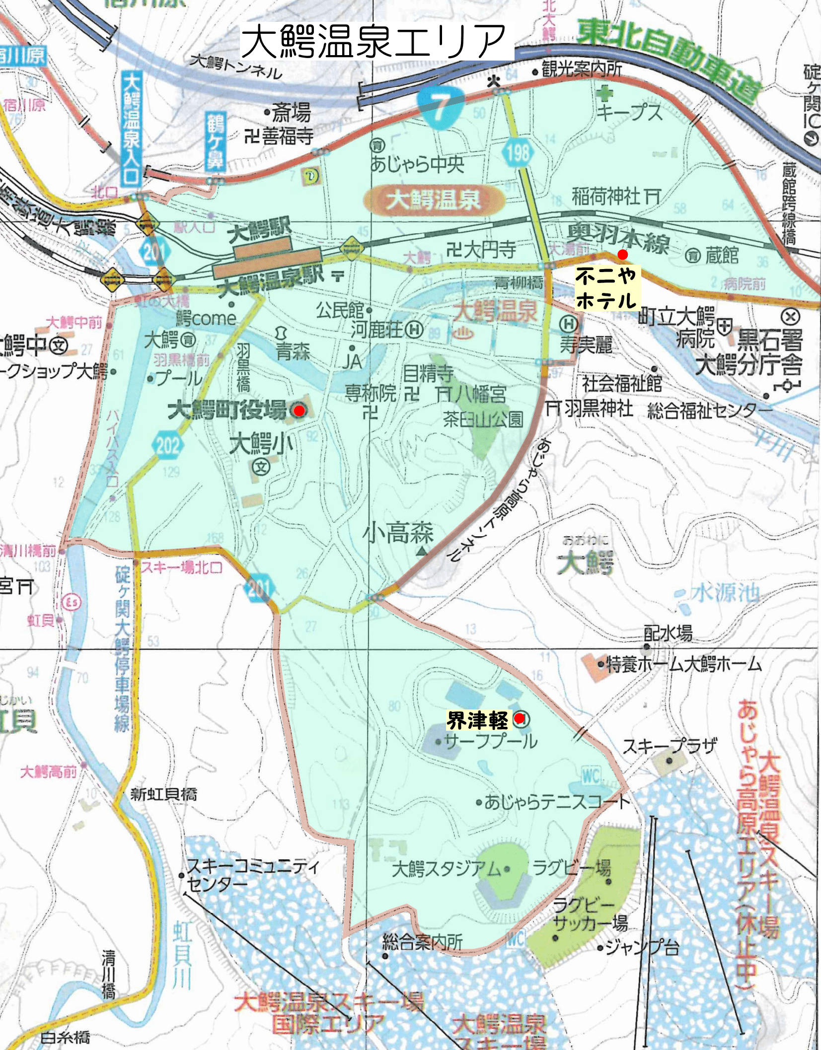 Main facilities Hotels | Main facilities: Owani Onsen Station, Daienji, Day Trip Hot Spring Wani come, Owani Onsen Ski Resort, Chausuyama Park Hotel: Hoshino Resort Kai Tsugaru Fujiya Hotel |