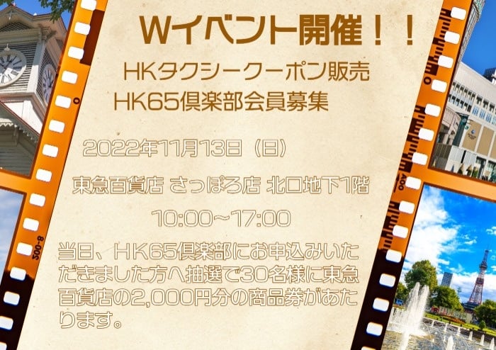 On November 11th (Sunday), HK13 club member recruitment and HK taxi Kupon sales event will be held on the first basement floor of the north exit of Tokyu Sapporo store.