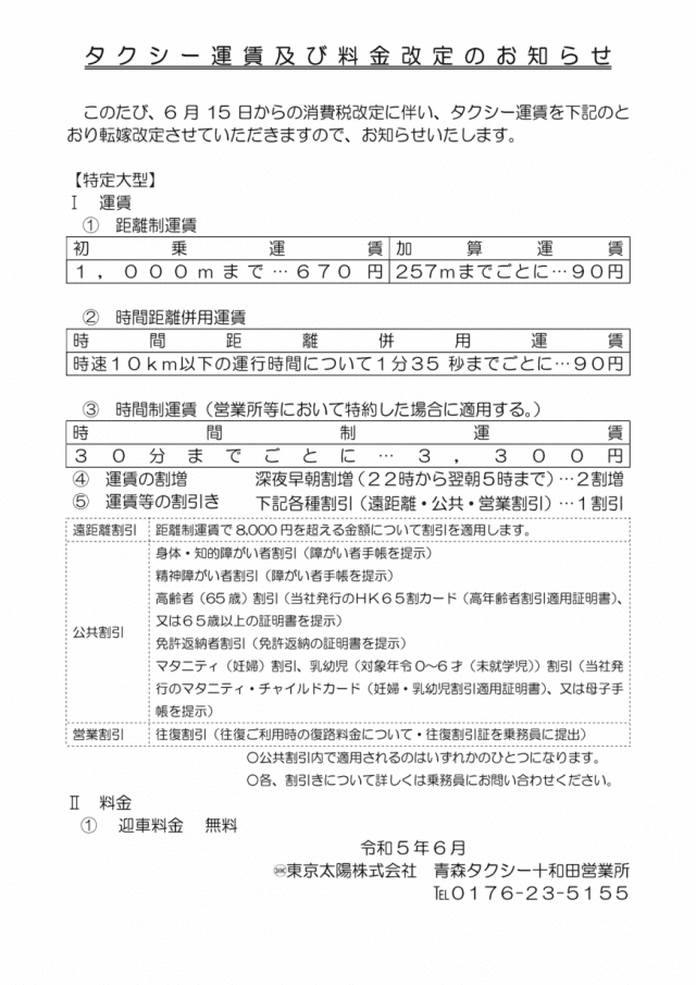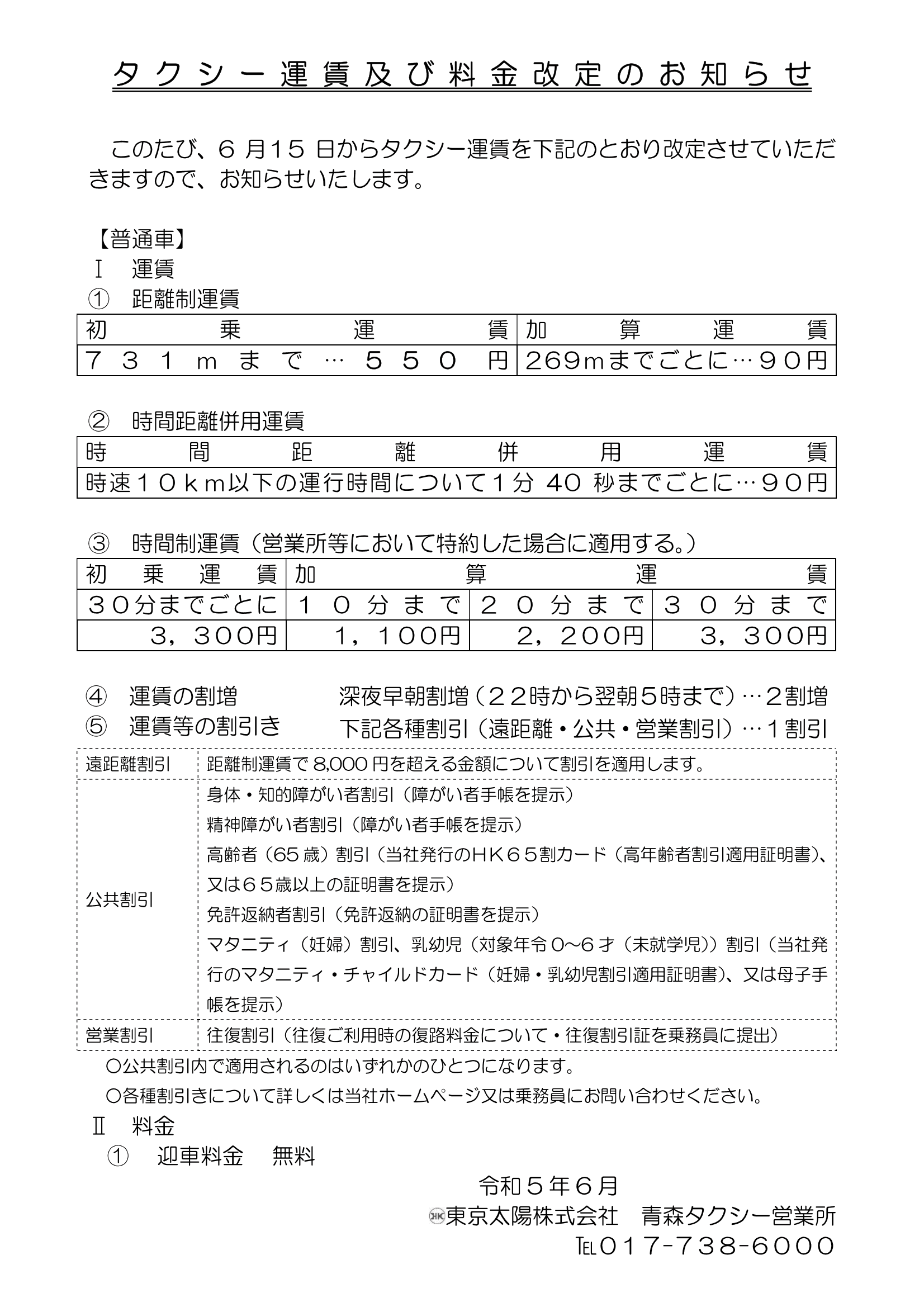 Aomori-News and Announcements Back to listJune 5, 6 Notice of taxi fares and rate revisions2023-06-15importantAomori Sales OfficeTowada Sales Office