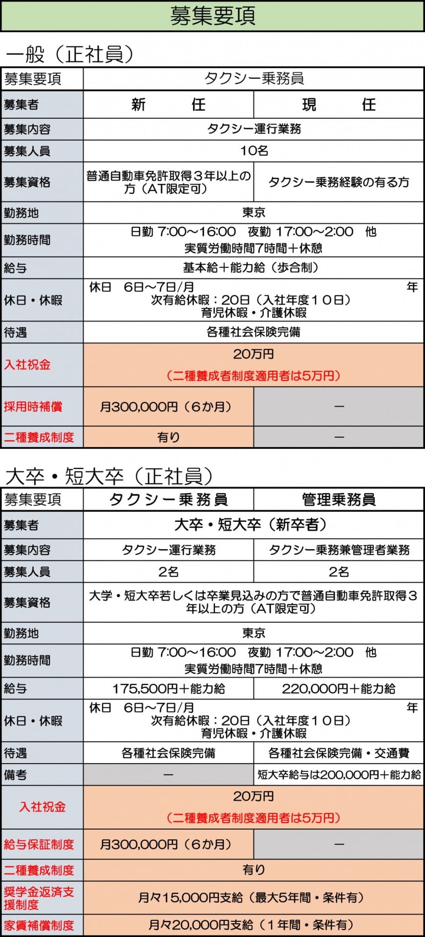 The company bears the full cost of acquiring the two-class license required for the crew.There is also a scholarship repayment subsidy system.In order to pass on the aging problem of the taxi industry to the next generation, we are working to develop a workplace environment that is easy to work for new graduates and young people who will be in the future society.