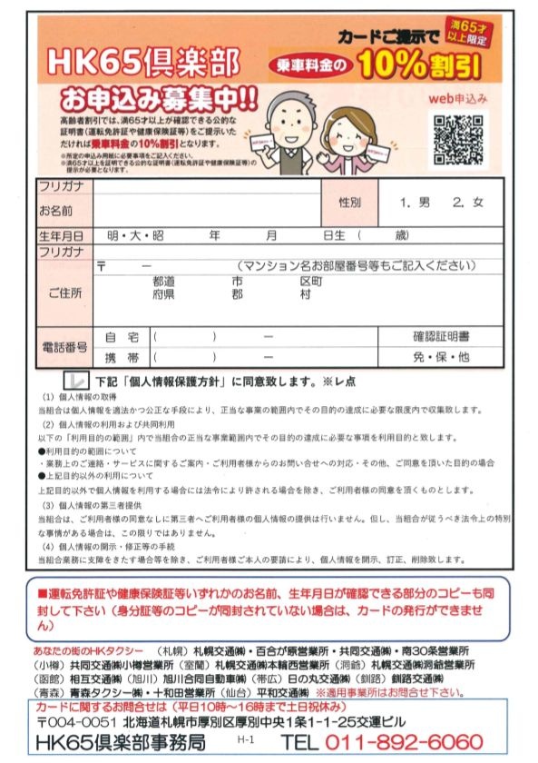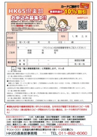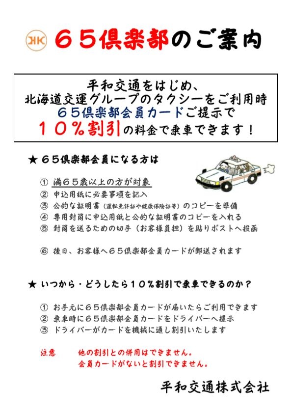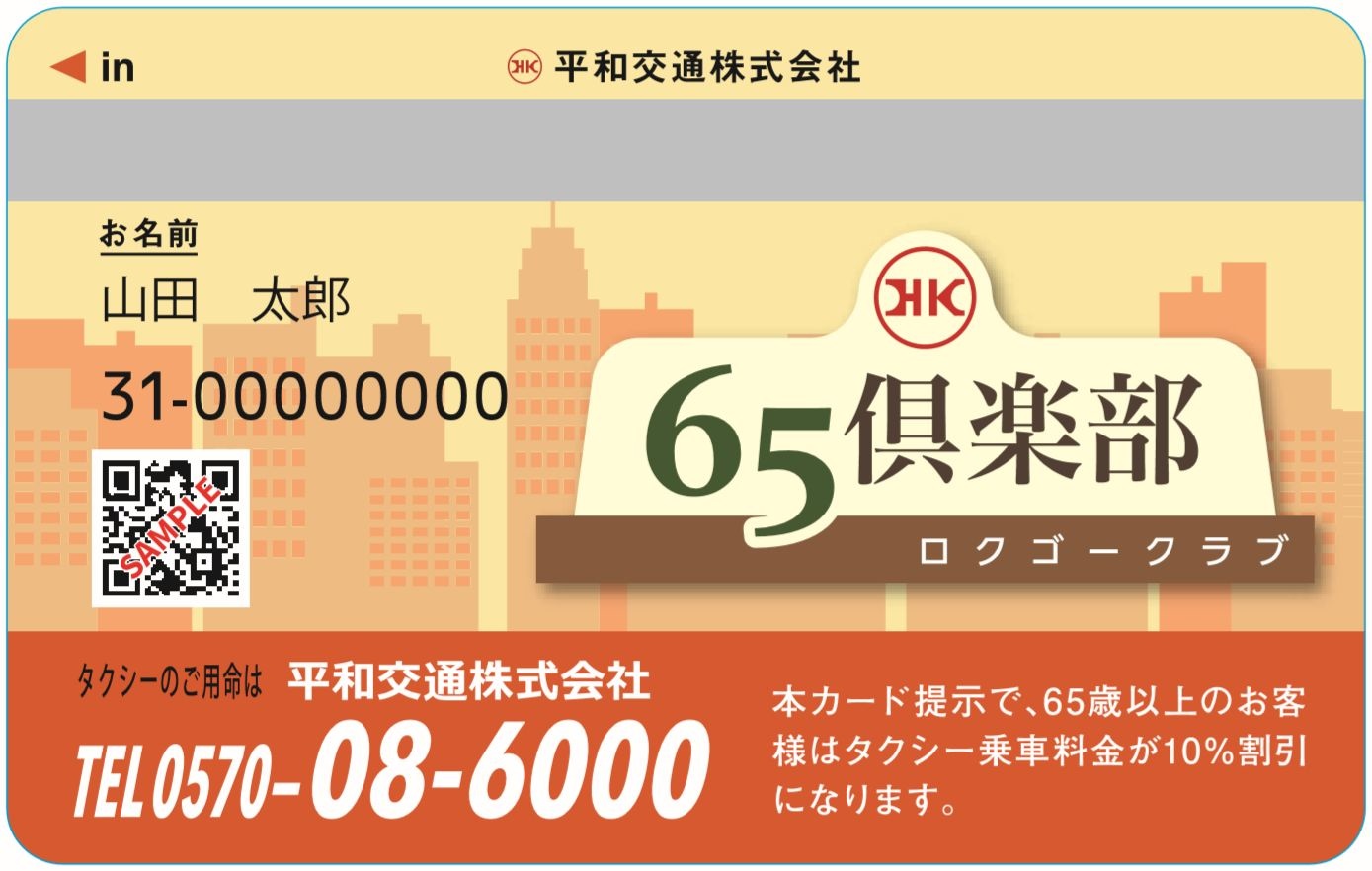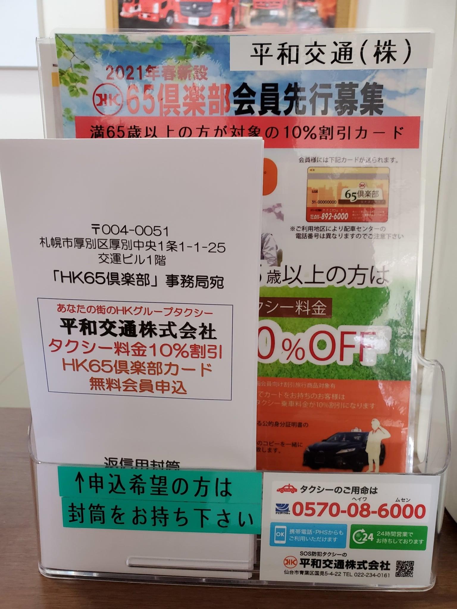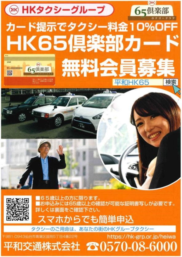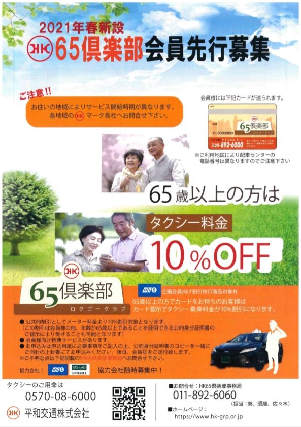 With the HK65 Club Card, you can receive common discounts not only for Heiwa Kotsu taxis, but also for all HK Group member companies in Hokkaido and Tohoku.