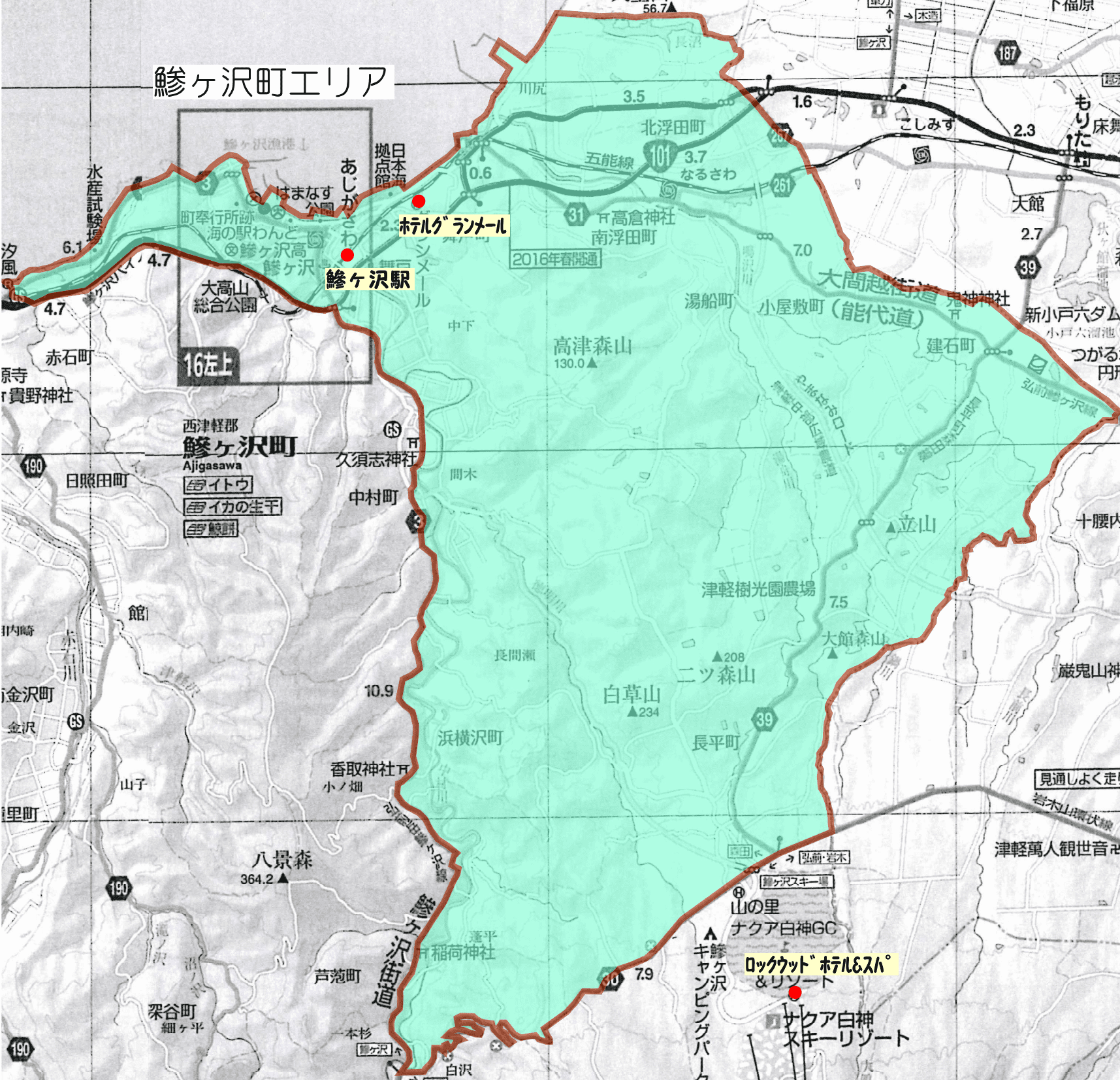 | Main facilities: Aomori Spring Ski Resort, Aomori Spring Golf Club, Nagahira Youth Travel Village, Kikuya Shoten, Ajigasawa Town Office, Sea Station Wand