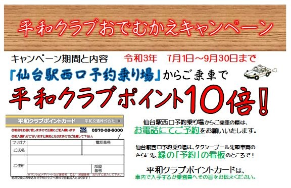 within the periodGet on from "Sendai Station Reservation Platform"(reservation by phone) Heiwa Club Point Card10x 10 points awardedI will do!