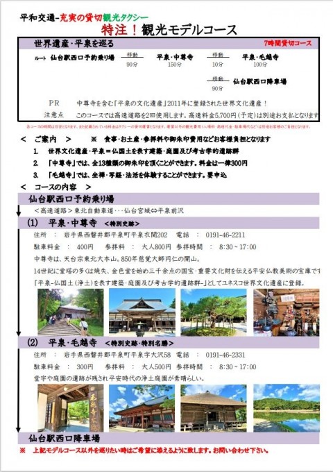 세계유산・히라이즈미를 둘러싼다(7시간 전세 코스)