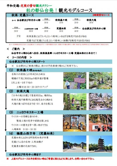 홋카이도 교운사업 협동조합의 평화교통-삼림의 센다이발!관광 모델 코스입니다각 코스의 안내 목록 보기아키호・정의 코스(5시간 전세 코스)아키호・정의 코스 <소요 시간>약 5시간<여행의 행정>센다이 역 및 센다이 시내 중심부를 출발↓아키호 기소쿄↓아키호 대폭포↓니카우지 스키 공장↓고쿠라쿠야마 니시호지(정의 여래)↓센다이역 및 센다이 시내 중심부까지<요금>보통차 32,000엔 예약 및 크레딧 결제점보 48,800엔