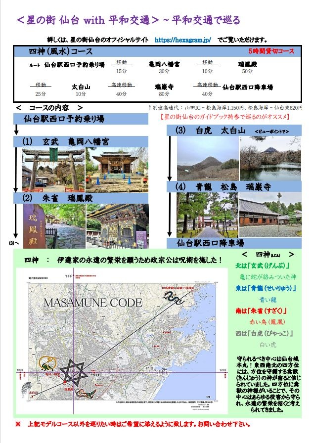 평화 × 별의 거리 센다이 · 2. 사신 코스별의 거리 센다이 × 평화 교통 사신(풍수) 코스 사신(풍수) 코스(5시간 전세 코스)사신(풍수) 코스 <소요 시간>약 5시간<여행의 행정>센다이 역 및 센다이 시내 중심부를 출발↓겐부 카메오카 하치만구↓주작 즈이봉전↓하얀 호랑이 태백산↓세이 류 마츠시마 서이지↓센다이역 및 센다이 시내 중심부까지<요금>보통차 32,000엔 예약 및 크레딧 결제점보 48,800엔 목록 보기트윗
