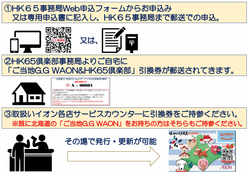 イオン北海道発行の「ご当地G.G WAON」にHKタクシーの高齢者割引機能が付いた新カード「ご当地G.G WAON&HK65倶楽部」カードがあればタクシーご乗車の際、カードご提示でタクシー料金が10%割引に。