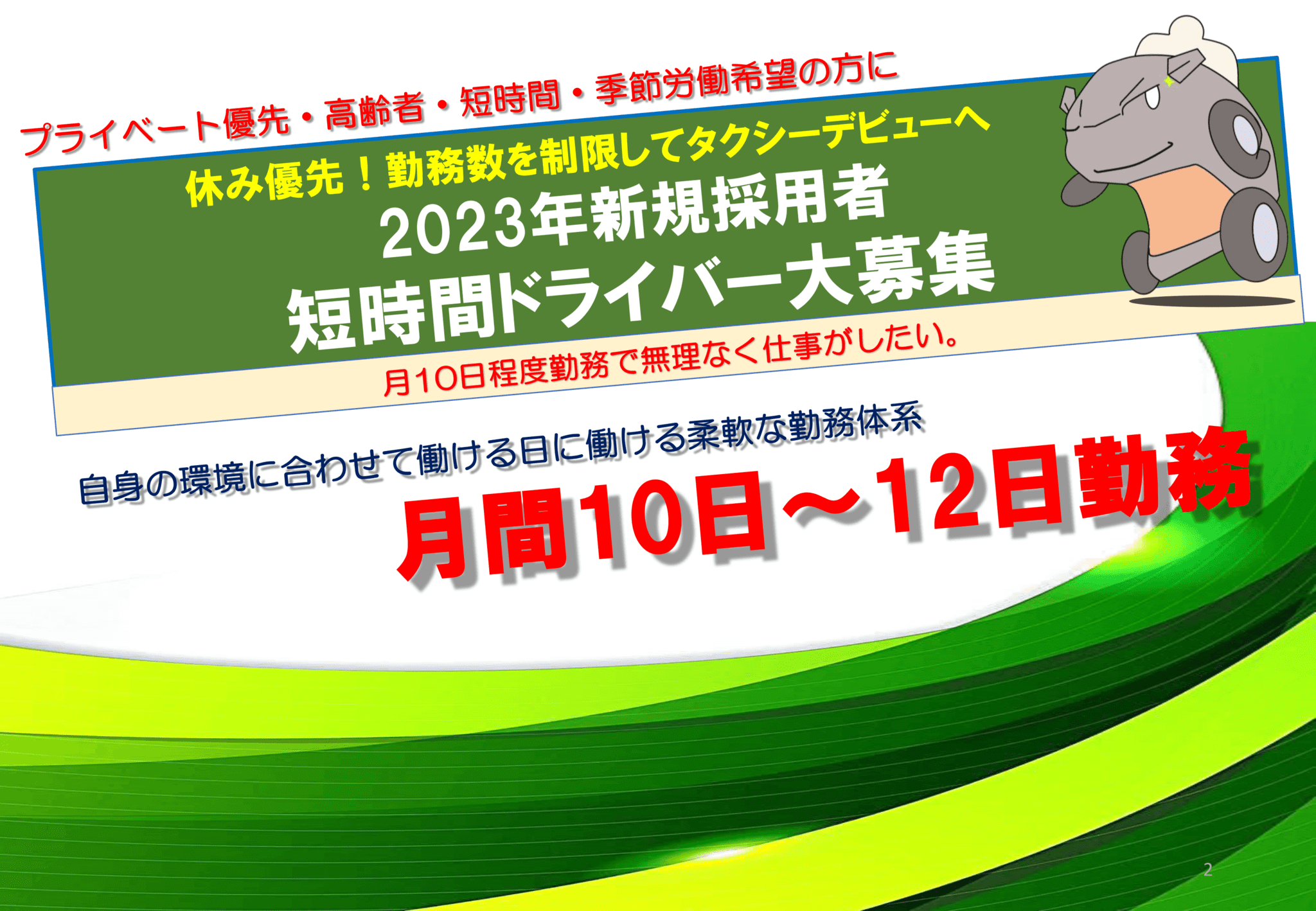 今、ロードマイスター(タクシー乗務員)が注目を集めています。法改正により、普通免許取得1年目でプロドライバー資格の取得が可能になり、特に若い方や女性からの注目度が高まっております。そんな未経験者のあなたでも安心して働ける職場をしっかりとサポートするため。釧路交通では「2023年新規採用者スタートダッシュキャンペーン」を実施中。「賃金補償」に加え、他社にはない「生活支援金を12か月間支給」。更にビジネスシューズやベルト。筆記用品に至るまでフルセット支給致します。お問合せは0154-52-3535 釧路交通まで。