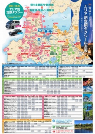 定額エリア/発着地 ※clickで詳細ページへ ※1印のコースは11月下旬~3月下旬冬期料金となります。 | 普通車 定員4名 (片道) | ジャンボ 定員9名 (片道) | 地図 | 予約 (問合せ) |