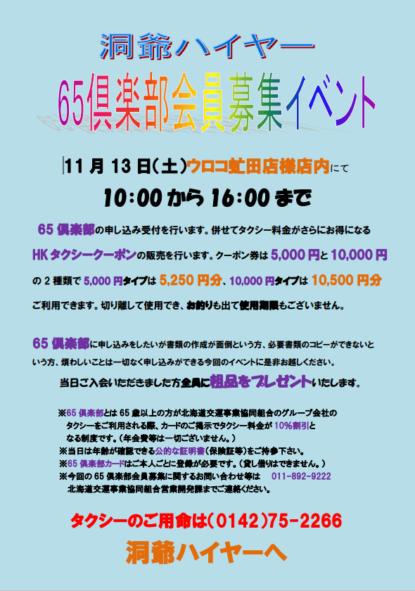 11月13日(土)ウロコ虻田店様で HK65倶楽部 会員募集イベント 開催!!