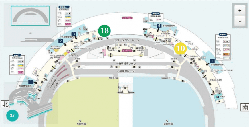地図上、18番(ANA、ピーチ・エアービジョン、エアアジア・ジャパン)をご利用でしたお客様はこちらでお待ちください。