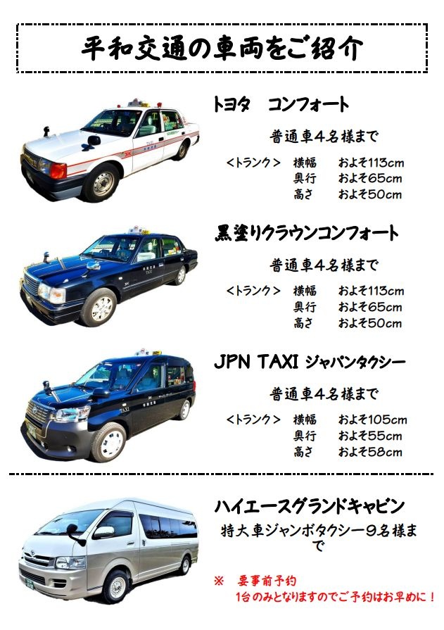 平和交通-タクシー車両・運賃・定員お問い合わせは 平和交通ナビダイヤル 0570-08-6000タクシー料金・定員はコチラ平和交通-車両一覧PDFトヨタ コンフォート (普通車4名様まで)トヨタ クラウンコンフォート (普通車黒塗り4名様まで)トヨタ JPN TAXI ジャパンタクシー (普通車4名様まで)※要事前予約 トヨタ ハイエースグランドキャビン (特大車 ジャンボタクシー9名様まで)RSS(別ウィンドウで開きます)
