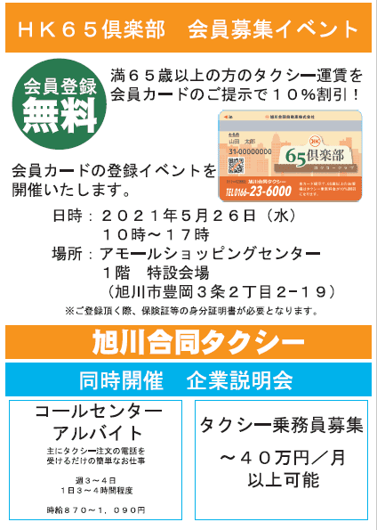 満65歳以上の方のタクシー運賃を会員カードご提示で10%割引する、おトクなカードです。