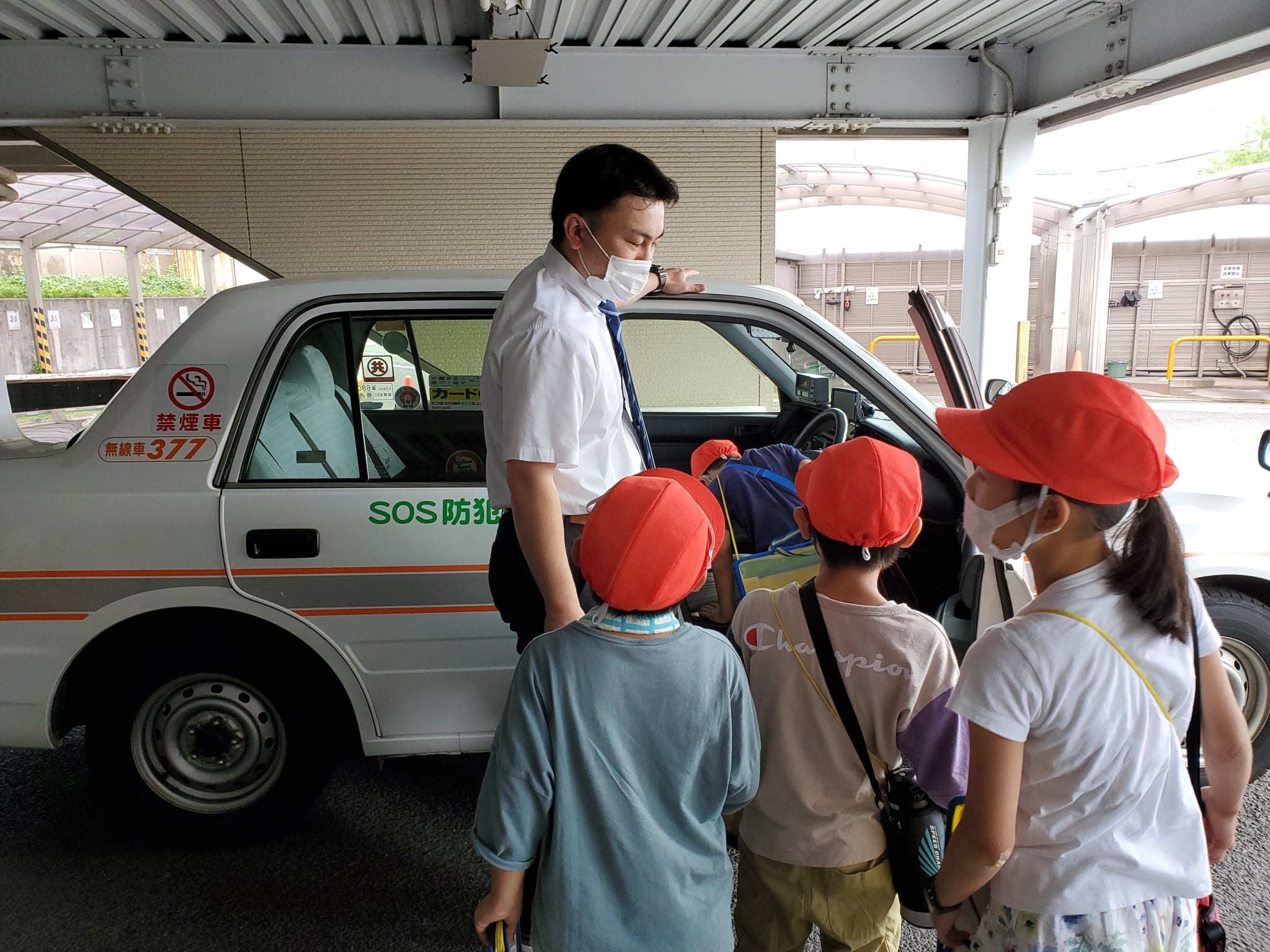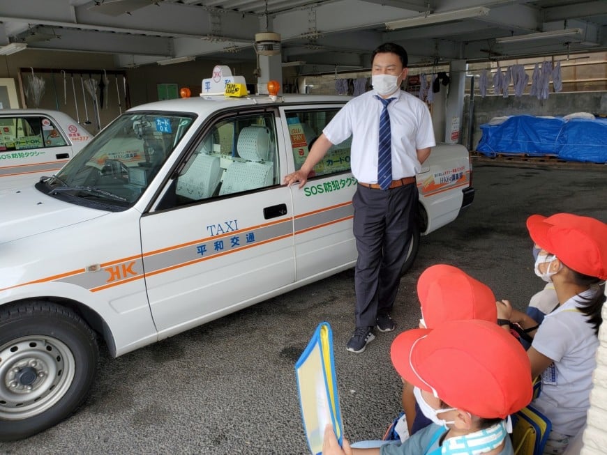 平和交通では、通常、毎年恒例で児童に「配車システム・GPSによる車両情報」「実際のタクシーで自動ドアの説明、実践・修理車両があればその様子」「会議室でタクシーについてのお勉強と質問コーナー」の3本柱で会社を案内します。