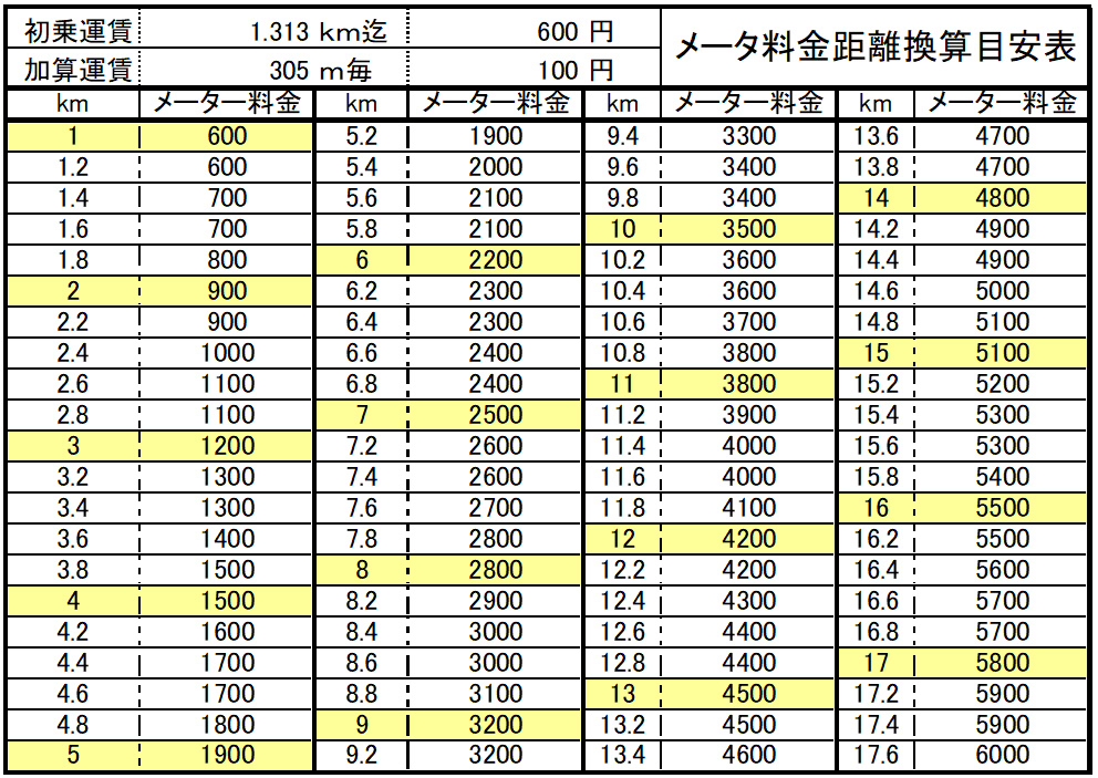 初乗り料金 | 最初の1.313kmまで 600円 | 20% 割増 |