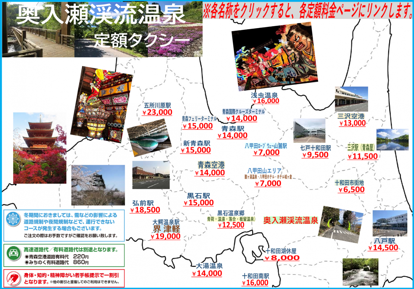 奥入瀬渓流温泉 タクシー料金|【安くてお得な定額料金】|青森タクシー
