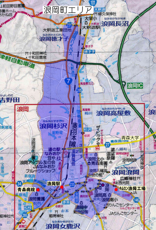 主な施設 | 道の駅なみおか・大釈迦工業団地・青森病院・青森県立養護学校・タムロン浪岡工場・浪岡駅・大釈迦駅・青森市中世の館・青森市立浪岡病院 |