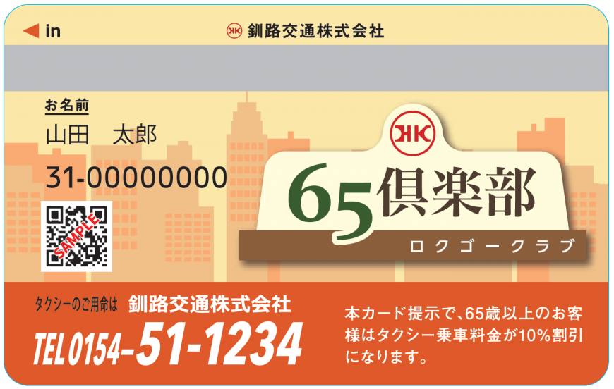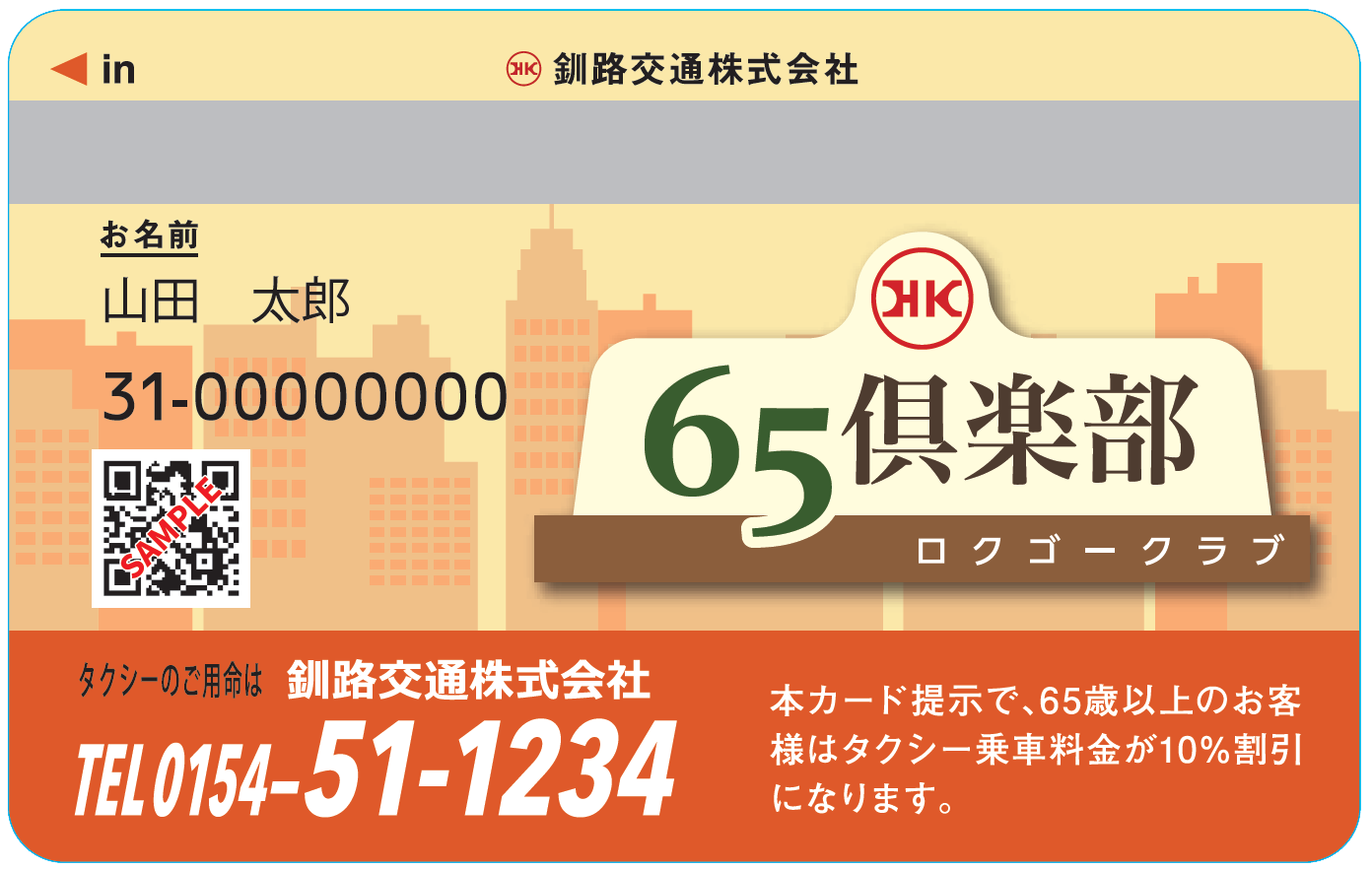釧路HK65倶楽部(高齢者割引)HKグループ加盟会社札幌 共同交通株式会社 札幌交通株式会社 函館 相互交通株式会社 旭川 旭川合同自動車株式会社 帯広 日の丸交通株式会社 釧路 太陽自動車㈱釧路交通営業所 小樽 共同交通㈱小樽営業所 室蘭 札幌交通株式会社本輪西営業所 青森 青森タクシー株式会社 仙台 平和交通株式会社 HK65倶楽部 無料会員募集中タクシーの利用時に10%の割引を受けられる「HK65倶楽部」サービスを開始致します。HK65倶楽部カードは釧路交通はもちろんの事、道内・東北すべてのHKグループ加盟会社で共通の割引を受けることが出来ます。普段のタクシー利用はもちろんの事、旅先などでタクシーを利用するときにもお得で便利なカードです。あらたに高齢者割引カードをご希望なら、HKグループのHK65倶楽部無料会員がおすすめです。是非お電話若しくは当社タクシー乗務員にお尋ねください。 手数料・年会費一切なし。有効期限もございません。簡単お申込みでタクシー料金10%割引。全国のHKタクシーで利用できます。HK65倶楽部(HK65割引)web申込HK65倶楽部web申込申込用紙ダウンロード申込用紙(2020-11-26 ・ 479KB) 釧路交通TOP