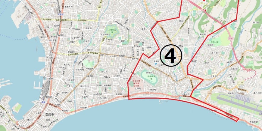 広野町 湯浜町 駒場町 深堀町 花園町 日吉町 榎本町 滝沢町 湯川町 根崎町 高松町 | 平成館しおさい亭 湯の川プリンスホテル渚亭 花びしホテル 湯の浜ホテル ものみの塔野口函館 ホテル雨宮館 湯の川温泉ホテルかもめ館 KKRはこだて 笑~えみ~函館屋 ホテルテトラ湯の川温泉 クレドホテル函館 竹葉新葉亭 旅館一乃松 割烹旅館 若松 大黒屋旅館 湯元漁火館 函館競馬場 函館ラ・サール学園 函館アリーナ 函館市民会館 |
