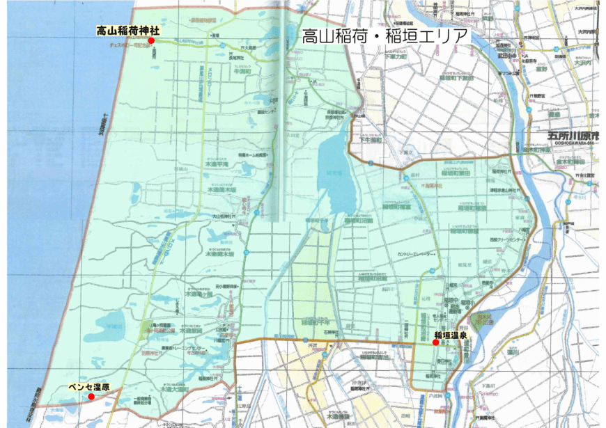 主な施設 ホテル | 主な施設: 高山稲荷神社・チェスボロー記念碑・ベンセ湿原・出來島海水浴場 ホテル: 稲垣温泉ホテル花月亭・彌生いこいの里 |