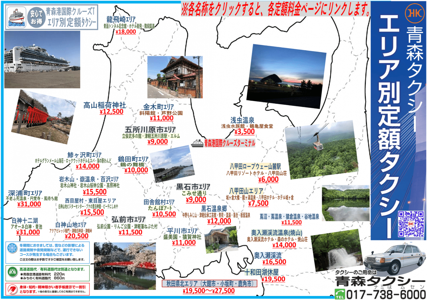 ①メーターより安い「定額料金」だから料金が高額になる心配はありません!②ドア・ツゥ・ドアで快適、青森港・青森市内から青森県内各地の観光地へらくらく移動!③乗換え無しだから、時間を気にせず時間に余裕をもって移動できます!