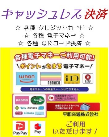 平和交通-キャッシュレス決済平和交通の各種サービスはこちらで確認いただけます!キャッシュレス決済キャッシュレス決済平和交通でのキャッシュレス決済!☆各種クレジットカード ・日本信販(ニコス)、ジャックス、日専連、ダイナース、JCB、アメックス、DC,VISA,UFJ、UC、オリコ、セントラル、ポケット、トヨタファイナンス、楽天カード、イオン、マスターカード☆各種電子マネー ・WAON,nanaco、iD、Edy、交通系IC、クイックペイ☆各種スマホ決済 ・PayPay、メルペイ、auPAY、d払い、楽天pay※各種タクシーチケットもご利用できます。