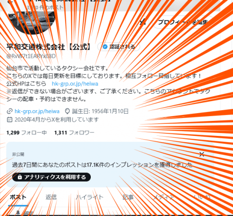 この度、平和交通で運営しております公式X(旧Twitter) @RvW7t1EARYxlJ8D のフォロワーが1300名を越しました。