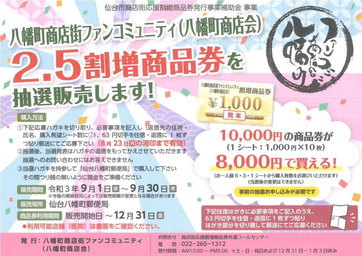 平和交通-新着情報平和交通-新着情報とお知らせ 一覧へ戻る八幡町商店街から『2.5割増商品券』のお知らせ2021-08-02「八幡町商店街2.5割増商品券」に関する応募はがき付きチラシは平和交通のタクシー車内後部及び平和交通事務所に設置しております。① <応募期限>8/23(月)の消印まで有効② <販売期限>9/1(水)~9/30(木)まで③ <商品券の利用期間>販売開始日~12/31(金)詳しくは→ //hk-grp.or.jp/publics/index/826/八幡町商店街からのお知らせ