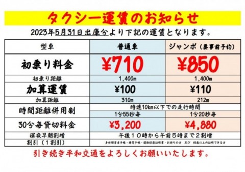平和交通-新着情報平和交通-新着情報とお知らせ 一覧へ戻る令和5年5月31日(水)出庫分から運賃改定のご報告2023-05-31いつも平和交通をご利用いただきありがとうございます。令和5年5月31日(水)出庫分より運賃改定となりますことをご報告いたします。普通車の初乗り料金が680円から710円に値上げとなります。今後とも平和交通をよろしくお願いいたします。