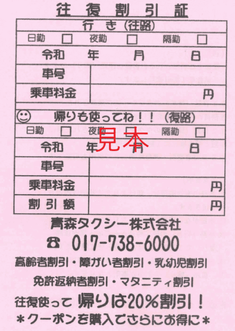 往復割引|青森タクシー|往復割引で最大20%お得に‼往復割引証各種割引と併用することで最大20%!。 青森タクシーHPトップページへ 65・妊婦・未就学児割引申込はコチラから メールでのお問合せはコチラからTEL. 017-738-6000〒030-0135 青森県青森市新町野字幾田2-28青森タクシー株式会社 ℡017-738-9977 fax017-738-6121