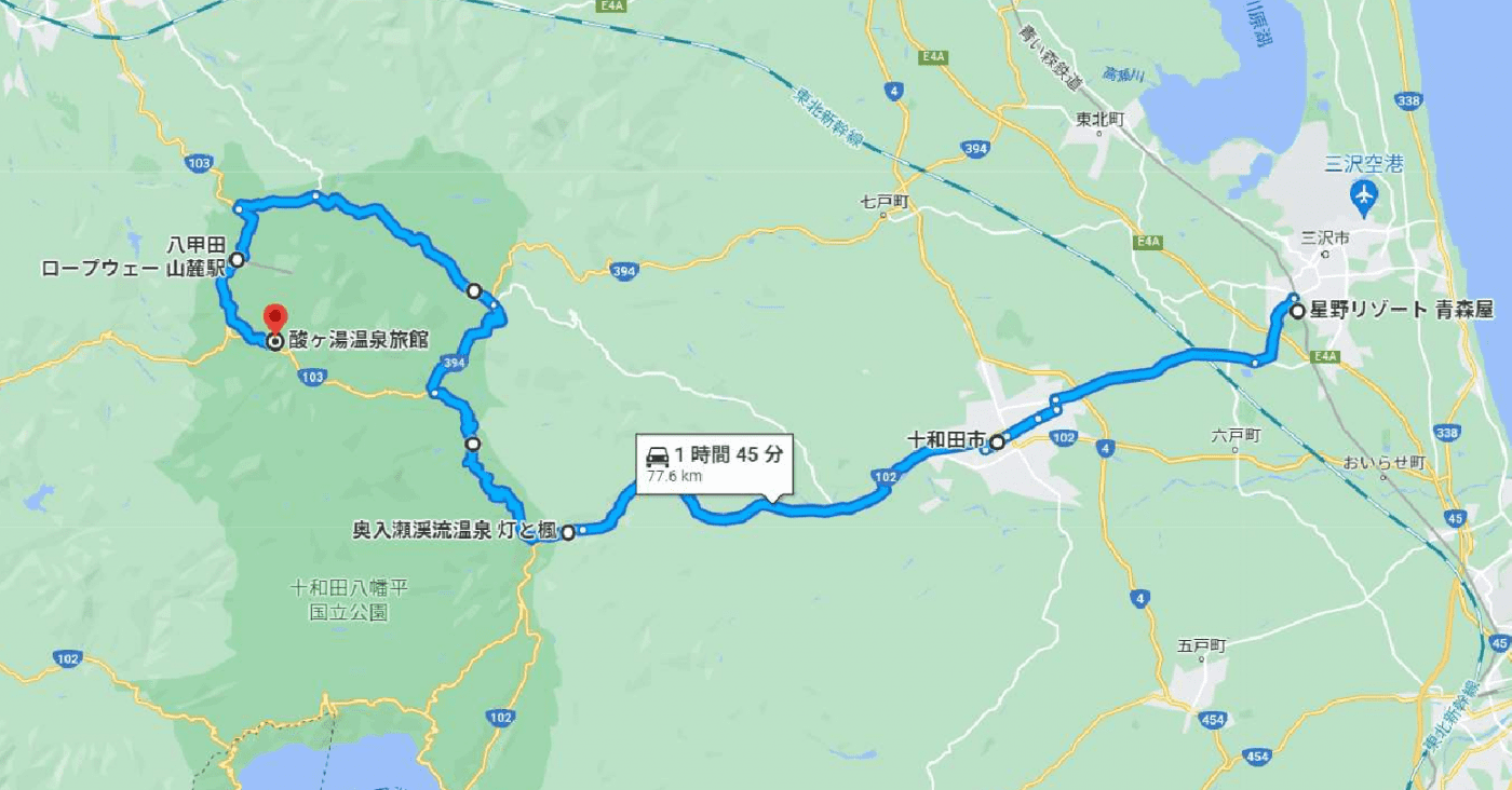 三沢駅(青森屋)⇔八甲田山エリアの定額料金「16,500円」の運行コース・三沢空港⇔八甲田山エリアの定額料金「18,000円」などの定額料金はは11月下旬から3月下旬まで通行止めとなる為、定額料金での運行は4月上旬から11月中旬となります。11月下旬から3月下旬までの料金については、奥入瀬渓流温泉経由、県道40号線田代平のコースとなり、料金については通常のメーター料金となります。
