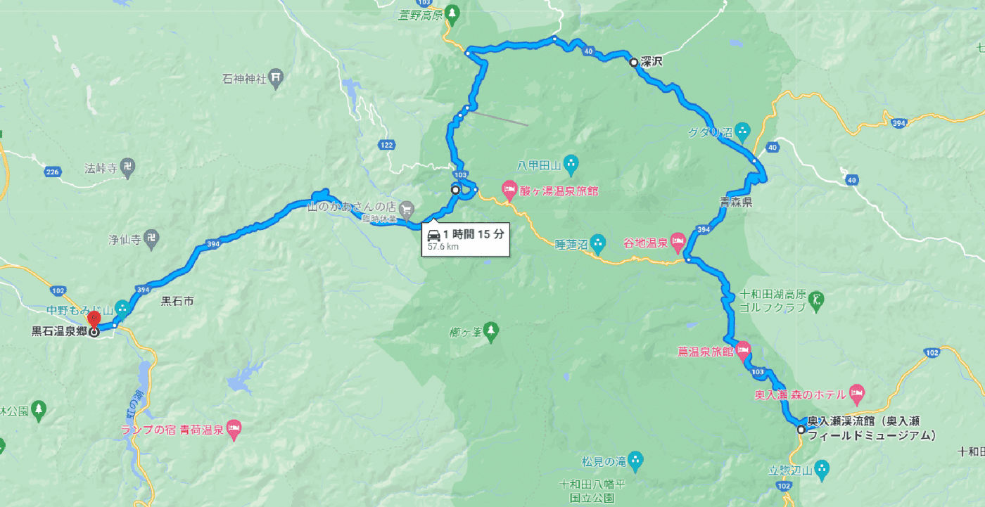 ※当日の天候状況により田代平40号線が通行止めとなった場合は、東北自動車道 黒石IC⇔小坂ICから樹海ライン経由のルート(タクシー料金約35,000円ほど)となりますのご了承下さい。