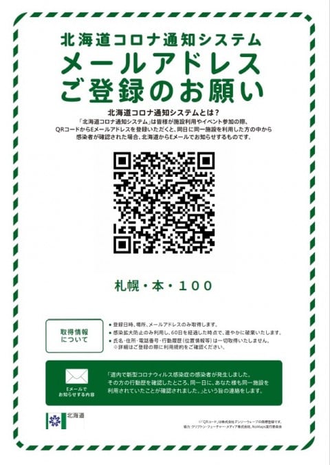 ご乗車の際に掲示されたQRコードからEメールアドレスをご登録いただくと、同日に同一車両を利用した方の中から新型コロナウイルスに感染した方が確認された場合、北海道からEメールでお知らせするものです。