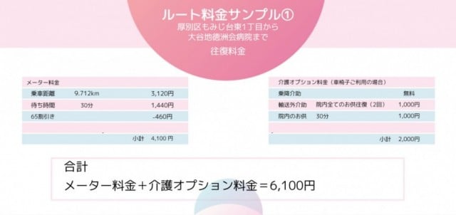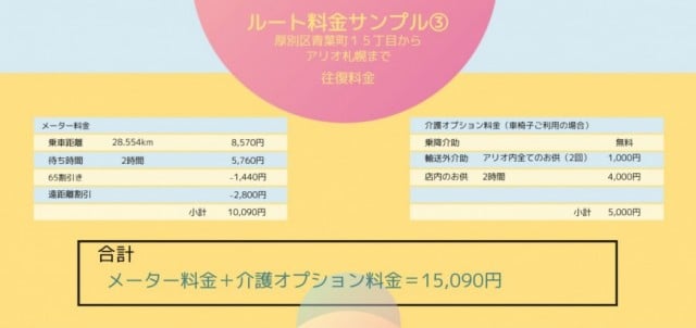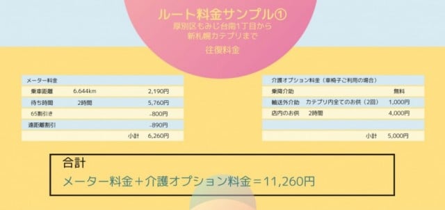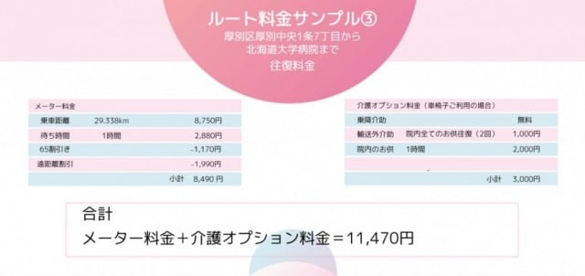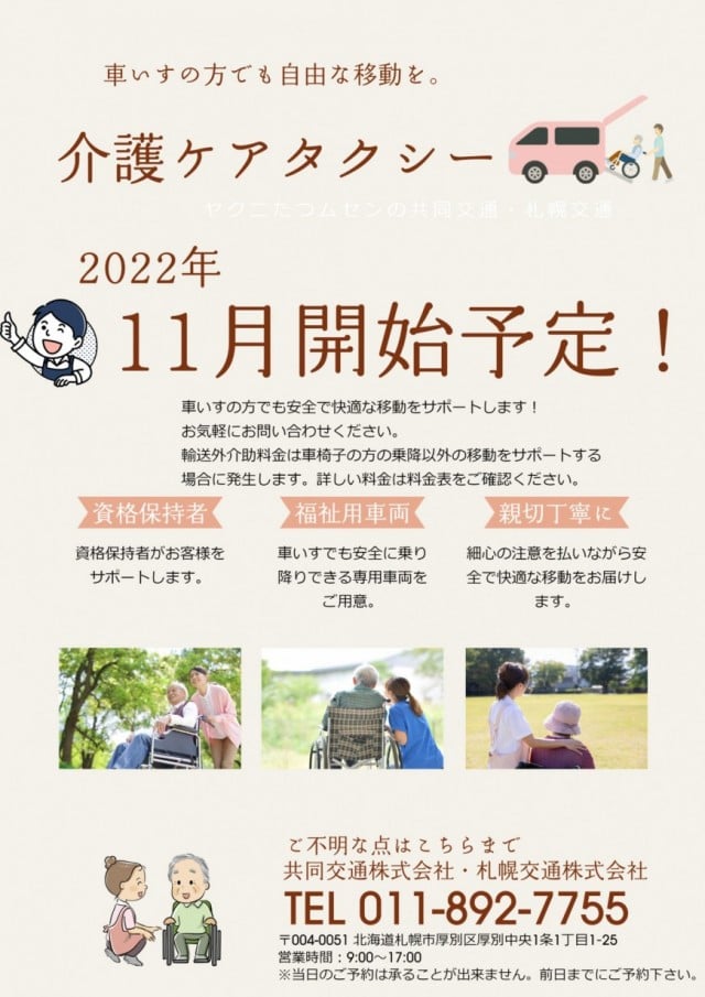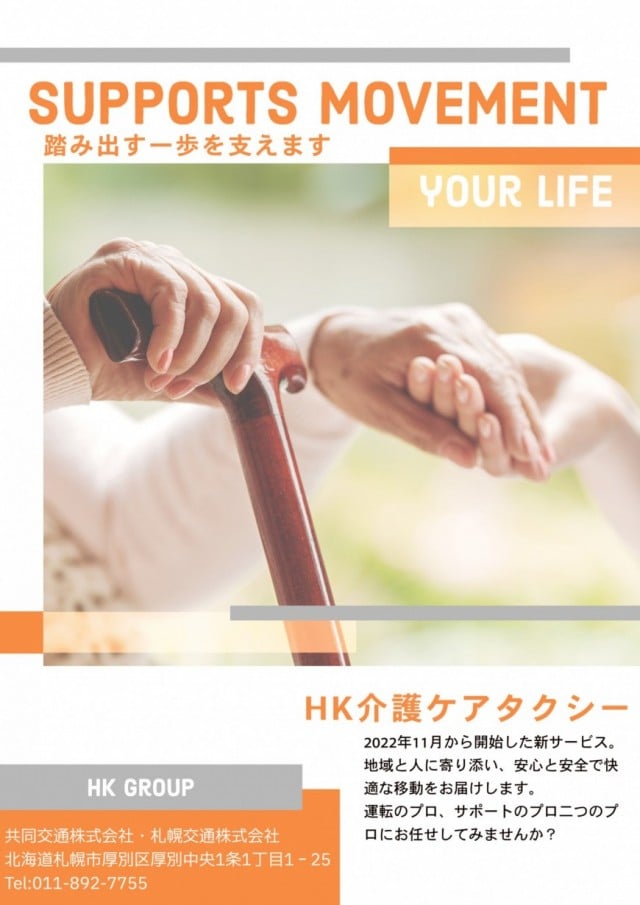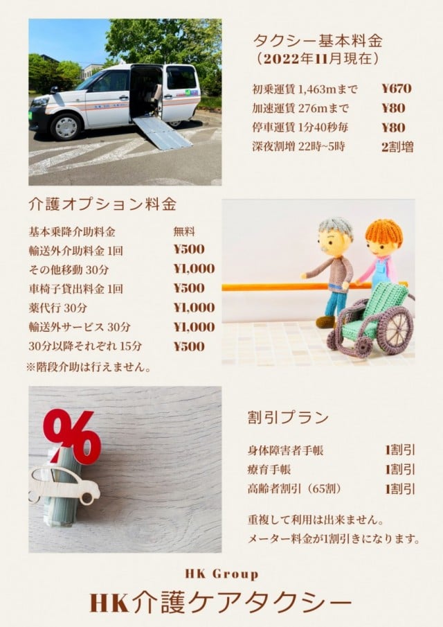 HK介護ケアタクシー2022年11月開始の新サービス「HK介護ケアタクシー」車椅子の方でも安全で快適な移動をサポートします。資格保持者がお客様を介助します。また車いすのまま安全に乗り降りできる専用車両をご用意、細心の注意を払いお客様をお乗せ致します。地域と人に寄り添い、安全で快適な移動を運転のプロ、サポートのプロ二つのプロに任せてみませんか?病院通院例※料金は道路状況等で前後することがあります。お買い物例※料金は道路状況等で前後することがあります。 お申し込みはこちら