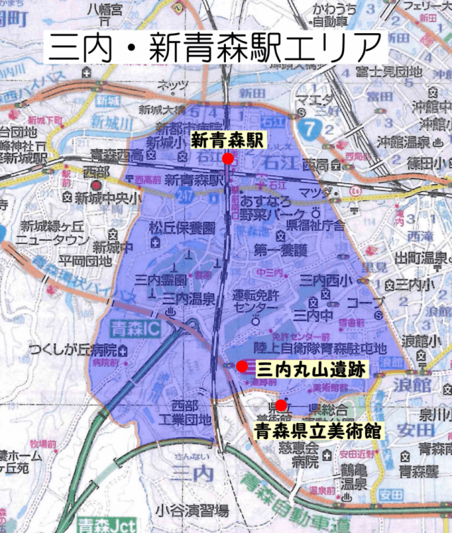 主な施設 ホテル | 主な施設:三内霊園・三内丸山遺跡・青森県立美術館・青森県総合運動公園・青森市西部工業団地・陸上自衛隊青森駐屯地・青森県運転免許センター・青森県立つくしが丘病院 主なホテル旅館:東横イン新青森駅東口 |