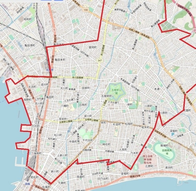 主な町名 | 美原1、2、3丁目(赤川中央通りより東側) 、4丁目 赤川1丁目,赤川町 神山,神山町 亀田中野町 亀田港町(有川桟橋引込線より南側) 港町1丁目(有川桟橋引込線より南側) 港町1~2丁目(有川桟橋引込線より南側) 追分町 北浜町 浅野町 吉川町 亀田本町 亀田町 万代町 海岸町 大川町 田家町 中道 鍛冶 東山 陣川 陣川町 松川町 中島町 宮前町 梁川町 八幡町 白鳥町 本町 柳町 千代台町 大縄町 時任町 人見町 乃木町 柏木町 川原町 山の手 新川町 杉並町 五稜郭町 松陰町 本通 富岡町 | 主な施設 ホテル |