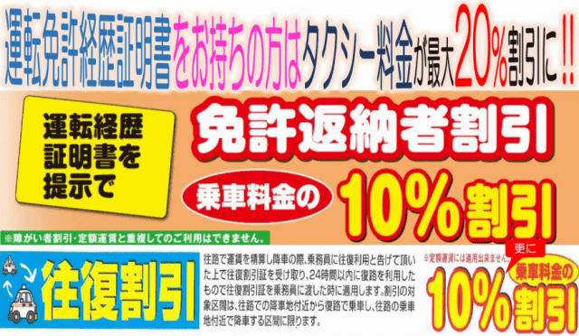お得な割引|免許返納割引|青森タクシー 青森タクシー株式会社ホームページ 青森タクシーお問合せTEL.017-738-9977〒030-0135 青森県青森市新町野字幾田2-28東京太陽㈱ 青森タクシー営業所 ℡017-738-9977 fax017-738-6121