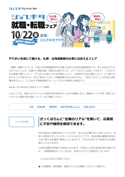 札幌交通株式会社札幌ー新着情報とお知らせ10月22日15:00~20:00ジョブキタ就職・転職フェア開催2021-10-21ジョブキタ就職・転職フェアに当社も参加いたします。運転が得意!接客業が得意!タクシーに興味のある方転職をお考えの方はぜひぜひ、ジョブキタ就職・転職フェアにご参加ください開催日:10月22日(金曜日)時 間:15時~20時場 所:ジョブキタビルhttps://www.its-mo.com/poi/ZIDX_BLD-7-22-50-64-5580280/一覧へ戻る