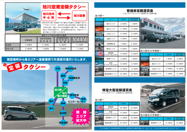 普通車タクシーで 旭川駅⇒コース目的地 又は コース目的地⇒旭川駅 までの片道直行のみで適応される料金フランです。その他にもジャンボタクシーの料金プランもございます。タクシーコールセンターにお問い合わせください。 |