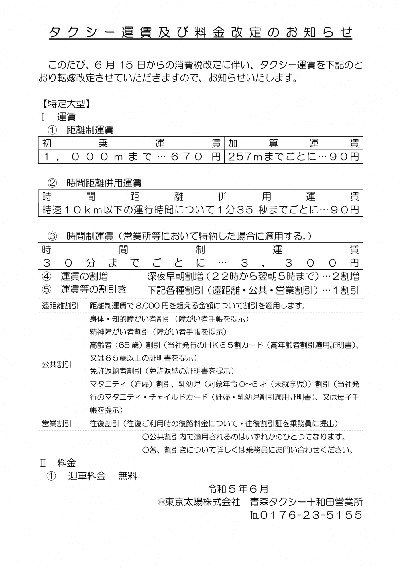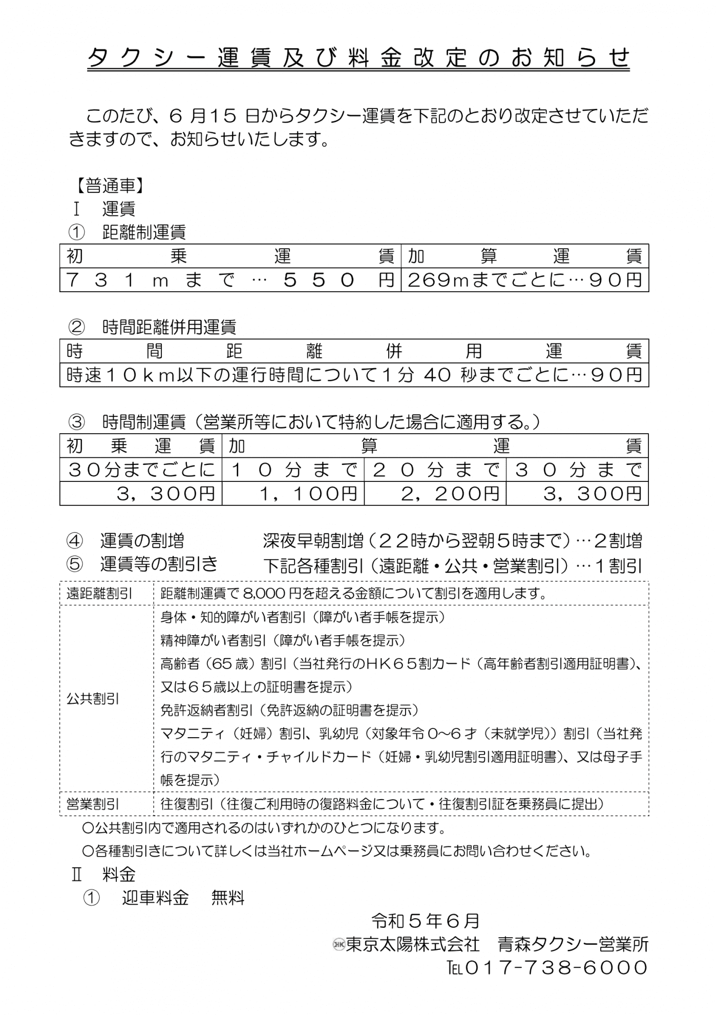令和5年6月15日タクシー運賃及び料金改定のお知らせ