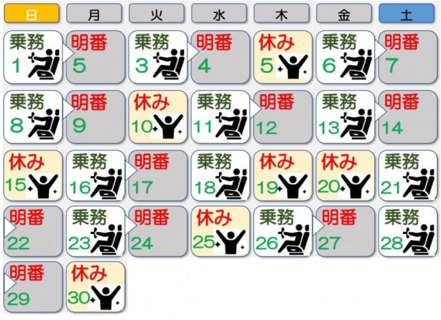 | 変形制(1ヶ月単位):勤務シフト表による、実働15時間、 休憩3時間(拘束時間18時間勤務翌日は明公休) (1)7:00~1:00 (2)8:00~2:00 (3)9:00~3:00 または 7:00~翌日5:00のうち18時間程度の勤務 休憩時間:180分 |