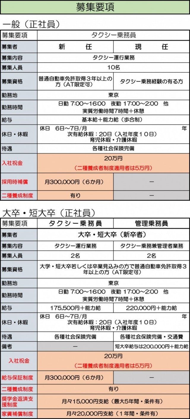 乗務員に必要な二種免許の取得費用は全額会社にて負担。奨学金返済補助制度もあります。高齢化問題が進むタクシー業界を次世代へつなげるため、わたしたちはこれからの社会に立つ新卒・若年層の働きやすさを考えた職場環境の整備に取り組んでいます。
