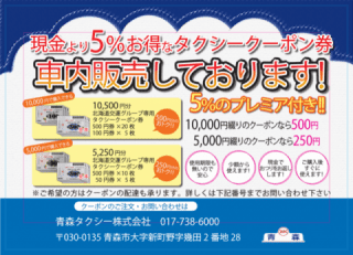 クーポン券はタクシー車内&青森タクシー㈱事務所で販売中です!