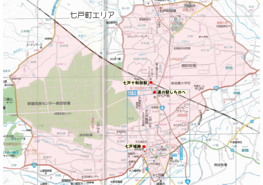 主要城镇名称 | 森上、森下、原久保、野崎狐久保、大泽、膝森、寒水、仓前、东槻木、笊田川久保、影津内、仓越、天神林、向田、寺里、前川原、上屋田 东上河原、后川原、西上川原、城后、七户、上町野、蛇坂、十役野, Udozaka, Notsugi, Kainokuchi, Arakuma, Teshiromori, Homori(如区域地图所示) |