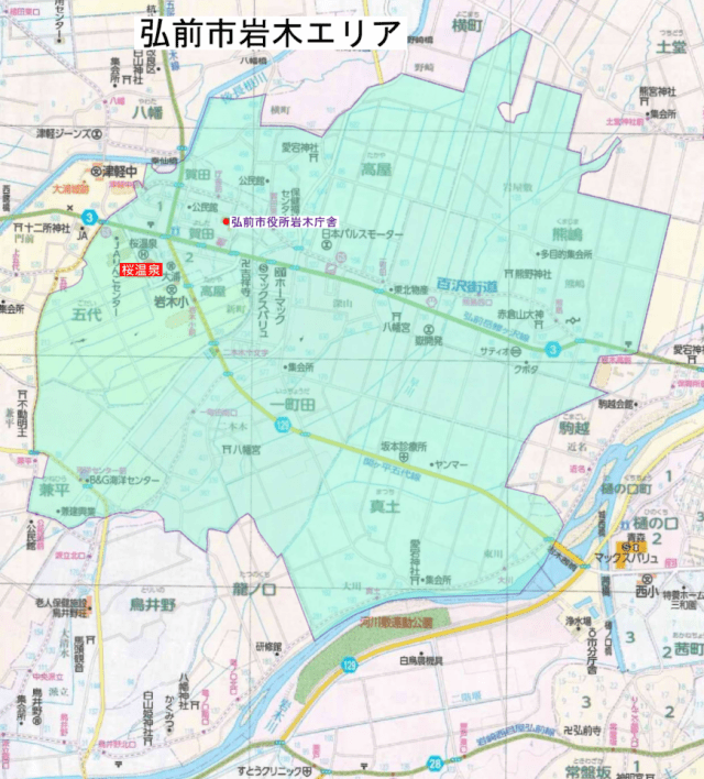 (距离弘前市政府磐城综合分所约43公里,所需时间约1小时10分钟。)