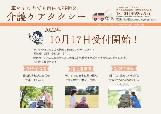 札幌交通股份有限公司札幌 ー 最新消息和公告 返回列表HK老人护理出租车11月1日起开! 10月17日开始接受预约!2022-10-12注意推荐的内容新服务“香港护理出租车”11月1日开始! !即使是坐轮椅的顾客也可以自由行动,并有合格的司机!如果您有兴趣,请与我们联系,因为您可以轻松前往医院或购物。10月17日起开始预约! !我们也接受 9:00 至 17:00 的电话!电话:011-892-7755您也可以从主页申请。申请使用HK老人护理的士
