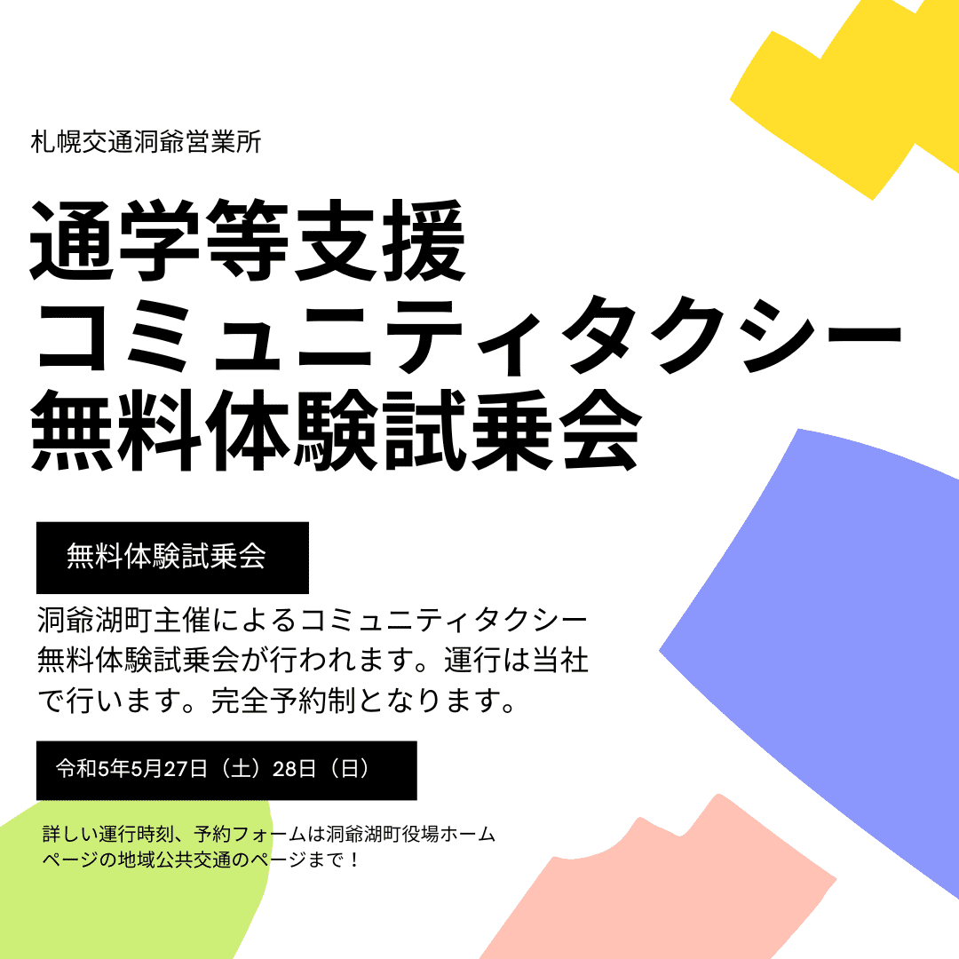 札幌交通股份有限公司札幌 ー 最新消息和公告 返回列表[Toya]社区出租车免费试乘活动2023-05-25注意推荐的洞爷湖町将于5年5月27日(周六)、28日(周日)举办为期两天的社区出租车免费试乘活动。我们会操作它。由于是完整的预约系统,请在洞爷湖町政府网站上的当地公共交通页面获取详细的运行时间和预约表格!请利用这个机会。