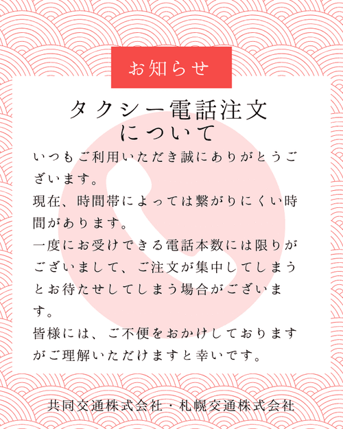 札幌交通股份有限公司札幌 ー 最新消息和公告 返回列表关于电话订购的通知2023-08-24注意总是感谢你的帮助。根据一天中的不同时间,有时会出现连接困难的情况。您需要稍后再次致电或等待我们接通。对于由此造成的任何不便,我们深表歉意,并感谢您的理解。
